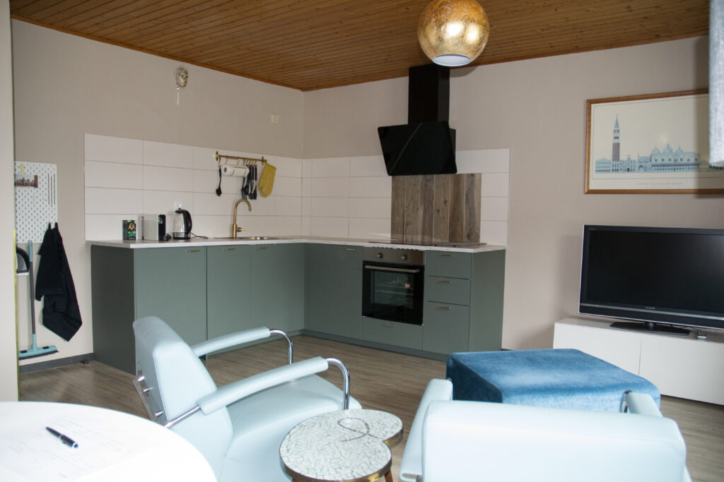 Het appartement heeft een volledig ingerichte keuken, eethoek en zithoek.